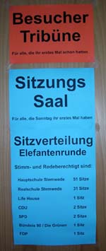 | Die Elefantenrunde Extra für alle ErstwählerInnen der Haupt- und Realschule Stemwede gab es am Donnerstag, 23. September, in der 5. und 6. Schulstunde eine Elefantenrunde. Eingeladen waren Vertreter aller vier Stemweder Parteien sowie die beiden Kandidaten für das Bürgermeisteramt. Alle kamen und stellten sich den Fragen der 82 anwesenden Erstwähler. Mit dabei waren: Fritz Möller (SPD), Frank Schröder (CDU), Wolfgang Fricke (FDP), Philip Marten (Grüne) sowie die beiden Bürgermeister-Kandidaten Wilhelm Riesmeier (SPD) und Eckehard Stauss (CDU). |
